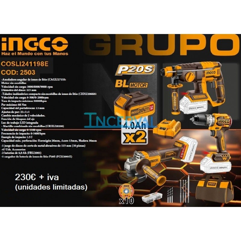 PACK Martillo demoledor + Amoladora 115mm + Taladro Percutor Atornillador 66Nm